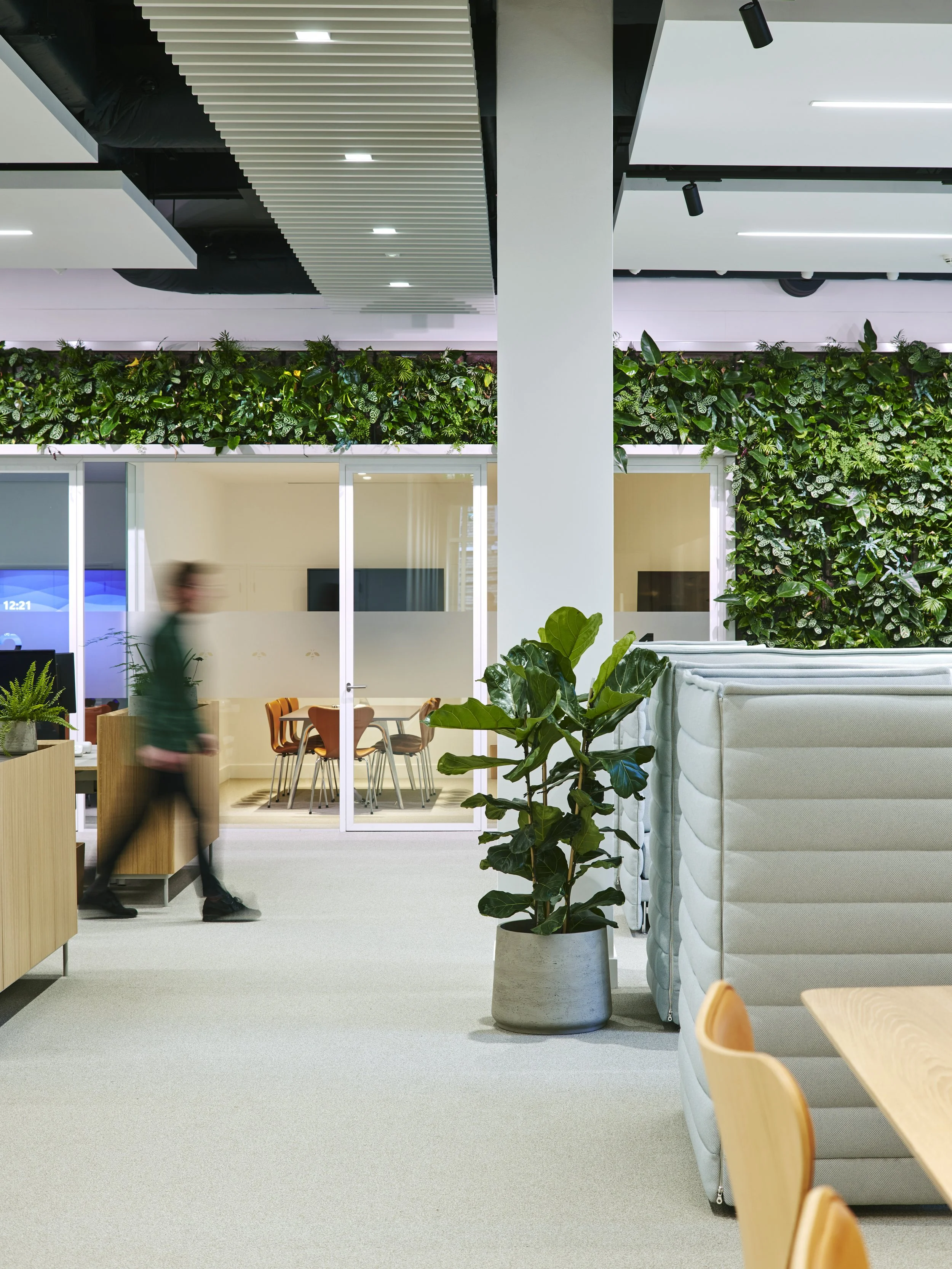 The team can choose to chat at the laptop bar, get cosy in high-backed armchairs, get their head down at an open-plan hot-desk, dial-in from meeting pods or disappear behind the green hedge for a private phone call.